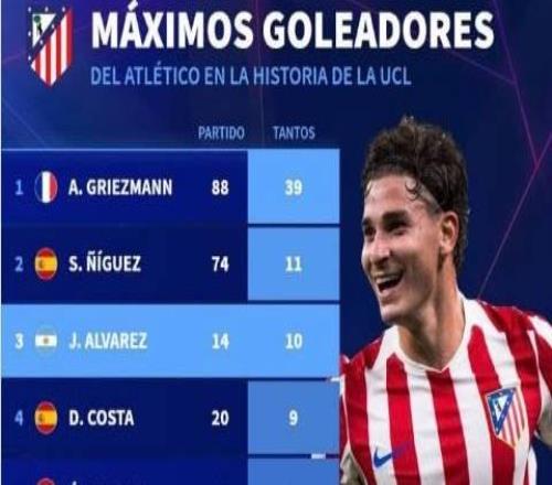 马竞队史欧冠进球榜:格列兹曼39球居首,小蜘蛛10球位列第三 -