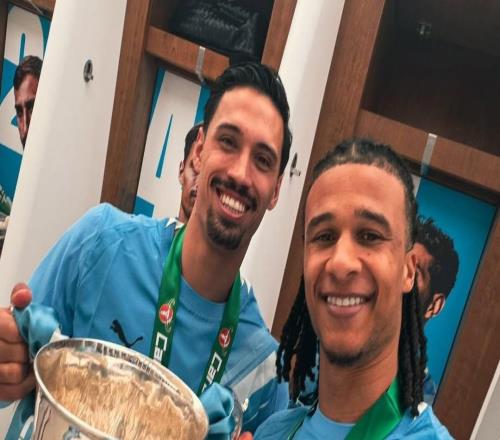 赖因德斯晒与奖杯合照:很自豪在这里赢得曼城生涯首冠 -
